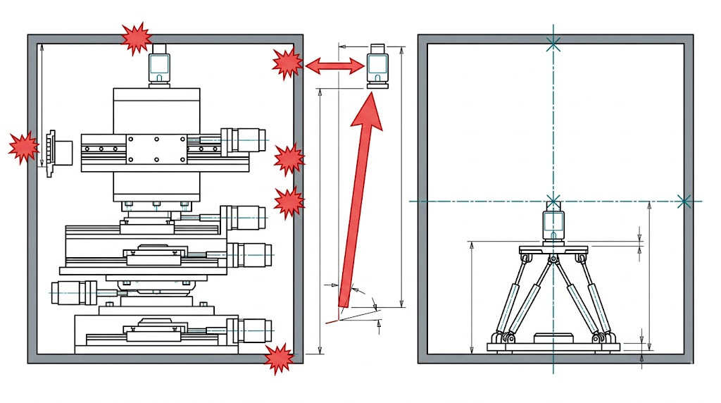 本圖對比限制空間內的運動系統:左側傳統堆疊式平台因體積龐大產生空間干涉(紅點),且過高放大阿貝誤差(紅箭頭),右側緊湊型六軸並聯運動平台(Hexapod)體積小、無干涉,完美解決限制。