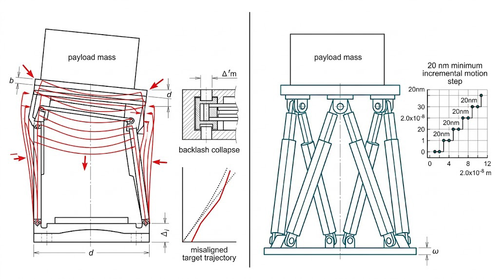 傳統結構(左)彎曲、背隙致軌跡偏差;六軸並聯(右)實現20奈米精密步進運動追蹤。