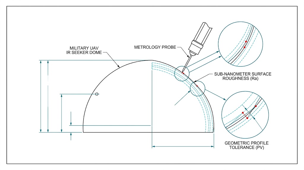 軍用 UAV 紅外尋標器圓頂計量示意圖:強調精密探針檢測下的亞奈米級表面粗糙度(Ra)與幾何輪廓公差(PV)極限。