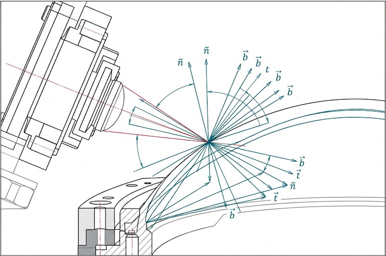 精密工件表面微分幾何分析圖。圖中標註了機械測量頭在彎曲表面切點處 ñ(法線)、b⃗(副法線)和 t⃗(切線)矢量的幾何關係及相互轉換。