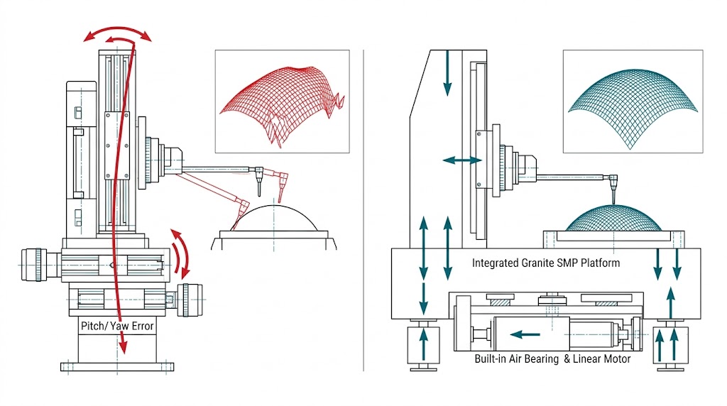 傳統拼裝滑台(左)幾何失真與誤差(紅);整合式花崗岩SMP平台(右)氣浮直驅無幾何誤差,呈現完美輪廓(藍)。