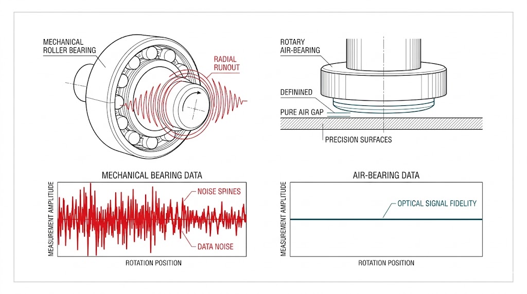 機械滾珠軸承的徑向偏擺會導致數據雜訊;而氣浮軸承透過純淨氣隙消除摩擦,提供卓越的光學信號保真度。