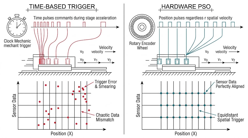 本圖對比加速時觸發方式:時間觸發(左)導致空間錯位與誤差;硬體PSO(右)實現精準等距觸發與資料完美對齊。