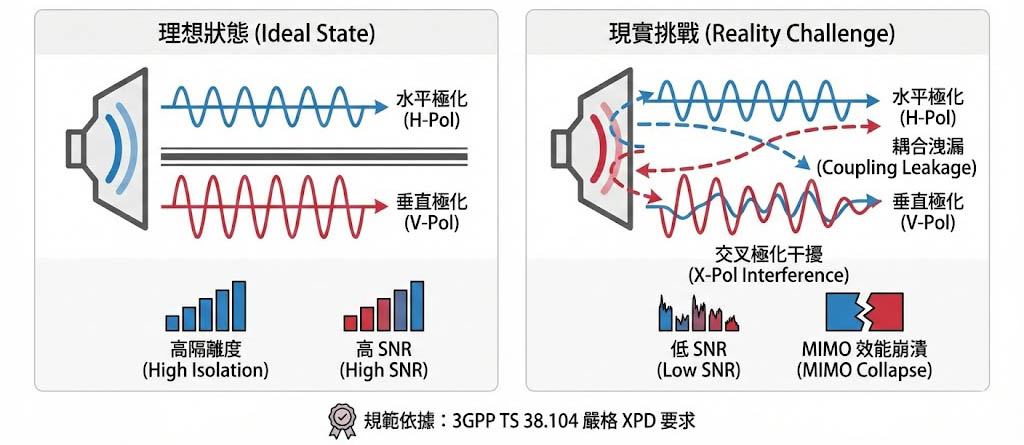 - 法規與規範: 依據 3GPP TS 38.104 與衛星通訊標準,對於 交叉極化鑑別度 (XPD) 有嚴格要求。