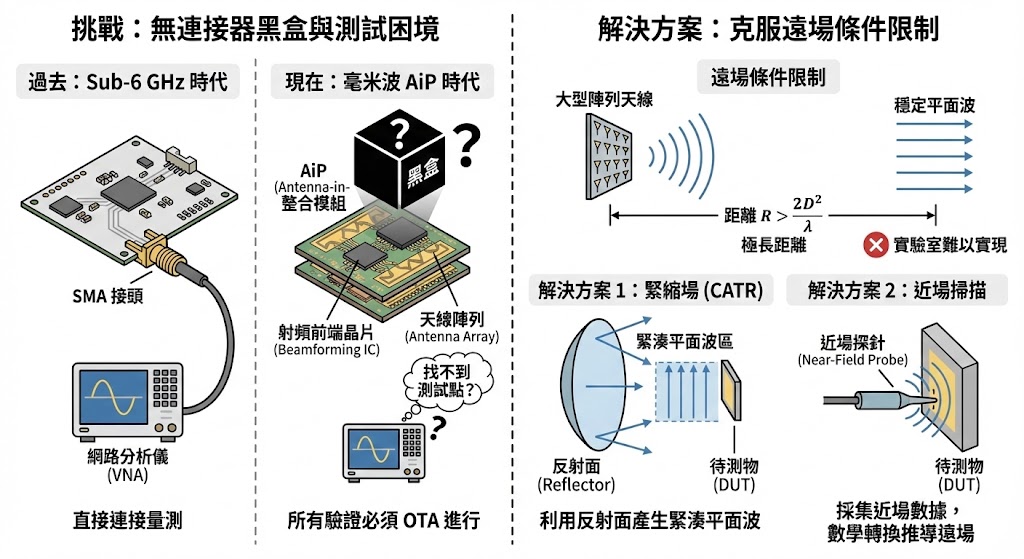 - 測試困境: 你找不到任何實體的射頻連接器來量測單一元件的駐波比 (VSWR) 或增益,所有的驗證都必須在 空中下載 (Over-the-Air, OTA) 的環境下進行。