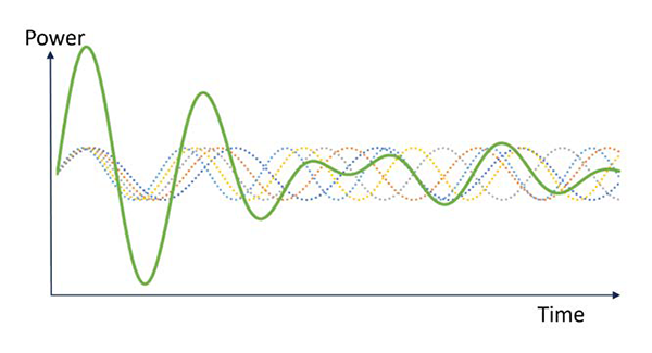 在時域(Time Domain)中,各個子載波訊號會進行疊加,導致複合訊號的功率位準產生巨大峰值,呈現出很高的峰均功率比,如圖 2 所示。