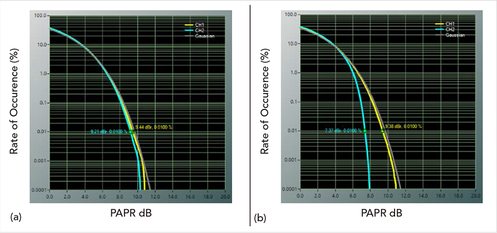 CCDF 圖顯示了 PAPR 大於特定數值的時間百分比,圖 11a 顯示當放大器基本上在其線性區運作時的情況(僅對最高峰值例外),在 0.01% 的發生機率下,輸入訊號(CH1)的峰值相對於平均訊號位準高於 9.4 dB,而放大器輸出(CH2)的對應值則相對於平均訊號位準高於 9.2 dB。