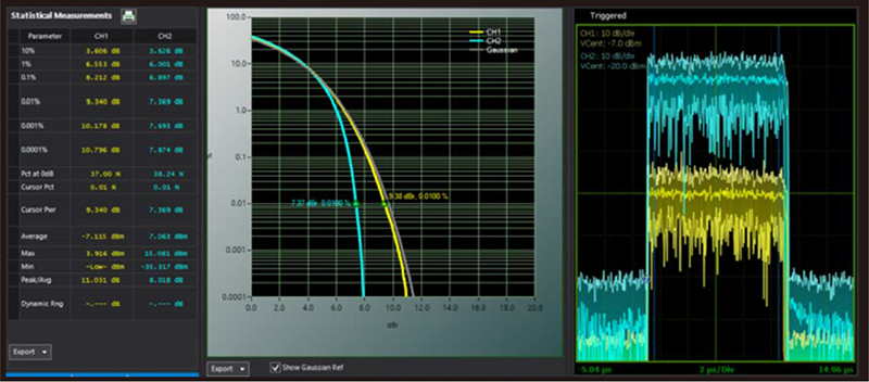 圖 12 展示了 Boonton Power Analyzer 軟體,當與 Boonton 的峰值功率感測器搭配使用時,該軟體能夠進行標準的峰值、平均和最小功率量測,以及脈衝參數、軌跡視圖和 CCDF 量測,除了 CCDF 圖形外,軟體也提供了數據化的 PAPR 結果,如左側所示,對應了各種 PAPR 發生率,這些圖形和數值結果可以匯出,以利製作報告或進行後續的資料處理。