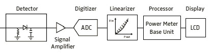 脈衝射頻訊號最關鍵的分析發生在時域,由於峰值功率計在時域中量測、分析並顯示射頻訊號的功率封包,因此它們是量測、分析及特性分析脈衝雷達應用中高功率放大器異常與行為的重要工具,圖 1 顯示了桌上型峰值功率計的簡化方塊圖。