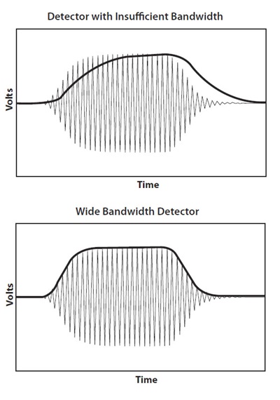 功率計的前端是射頻封包檢測器,它安裝在功率感測器中,該檢測器移除射頻載波並產生代表射頻輸入訊號封包的類比波形,檢測器最關鍵的技術規格是其對脈衝射頻訊號的反應時間,或稱其上升時間,如果檢測器沒有足夠的頻寬來追蹤訊號的封包,則所有量測(包括峰值功率、脈衝功率和平均功率)的準確性都會受到影響 (圖 2)。