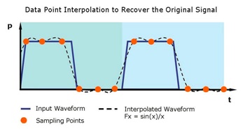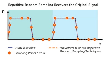檢測器的輸出隨後由類比數位轉換器 (ADC) 進行數位化,數位化後的取樣由數位訊號處理器進行線性化和量測分析,處理後的波形以功率對時間的方式在時域中顯示,並同時顯示自動脈衝和標記量測結果。在 Boonton 的峰值功率計中,垂直軸以瓦特、伏特或 dBm 顯示功率(或電壓),並能夠更改刻度和垂直中心,在水平軸上,時基可以設定低至每格 5 ns (50 ns 範圍),以便放大到波形的特定部分,例如上升緣或下降緣,以觀察波形的細微細節,Boonton 的峰值功率計使用隨機交錯取樣 (RIS,Random Interleave Sampling) 技術,該技術可在重複波形上產生 100 ps 的解析度,圖 3a 顯示了傳統取樣和內插方法的時域圖,圖 3b 顯示了 RIS 方法,圖 3c 顯示了在 Boonton 4500C RF 峰值功率分析儀上,從傳統方法到 RIS 方法解析度如何提高。