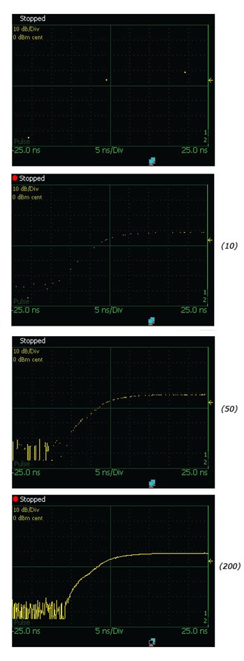 圖 3c. 這四個螢幕截圖顯示了如何透過重複取樣技術建立波形,第一個掃描 (頂部) 顯示了三個初始資料點,彼此等距 20 ns,其餘三個則分別顯示 10、50 和 200 組額外的資料,此方法可達到最高解析度,允許「放大」快速訊號。