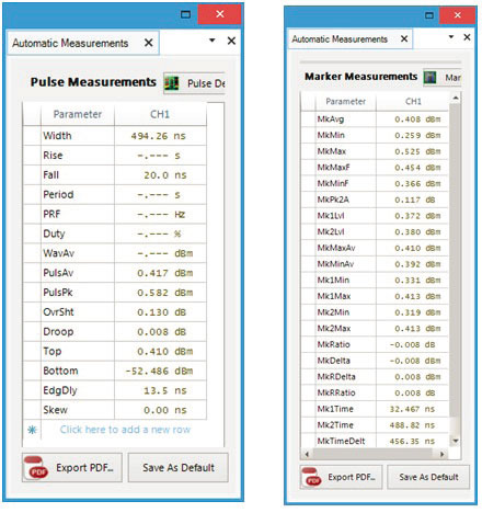 在量測能力方面,峰值功率計可執行眾多手動、自動標記和自動脈衝量測,自動脈衝量測 (圖 4) 提供了許多關鍵參數的量測值,有助於特性分析功率放大器和雷達系統的效能,上升時間與下降時間指出放大器輸出脈衝射頻訊號的能力,過衝則指出了潛在的振鈴問題,下垂顯示了放大器電源在長時間脈衝寬度下的限制,脈衝寬度、週期、脈衝重複率和工作週期量測則提供了訊號的其他時域特性,此外還有許多自動標記量測 (圖 4 右側),可實現時間閘控量測,這些量測在兩個標記之間執行,並提供平均功率、峰值功率、最小功率和最大功率讀值,以及峰均比、功率位準的差值標記和時間的差值標記量測。