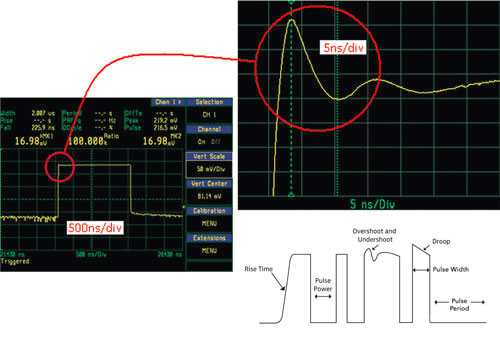 圖 2. 感測器的上升時間和頻寬能力對準確量測和顯示脈衝射頻訊號的影響。