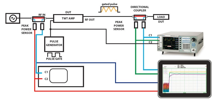 在圖 6 中,雙通道功率計在 P1 量測輸入訊號功率,並在 P2 量測時域中的反射功率,用於計算回波損耗,同時監測反射訊號的異常情況,在 P3 監測和量測放大器的輸出,前一節中提到的關鍵放大器參數在 P3 進行量測,而 P4 則監測負載的反射功率,調變射頻輸入訊號的閘控訊號也可以觸發功率計,從而實現延遲和潛時量測,Boonton 效能最高的桌上型峰值功率分析儀,型號 4500C,配備了波形數學運算功能,能夠在時域中顯示增益和回波損耗,此儀器還配備了兩個示波器通道,當施加於放大器的閘控訊號觸發峰值功率計時,閘控訊號和放大器的輸出都可以顯示在峰值功率計上,從而實現關鍵的時序量測,並檢測任何由閘控訊號引起的放大器異常。