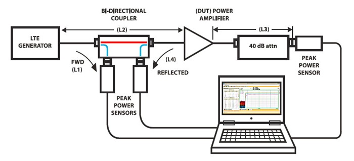 圖 7. 測試配置顯示使用三個感測器和一個定向耦合器進行的時域純量式增益和回波損耗(RL)量測。