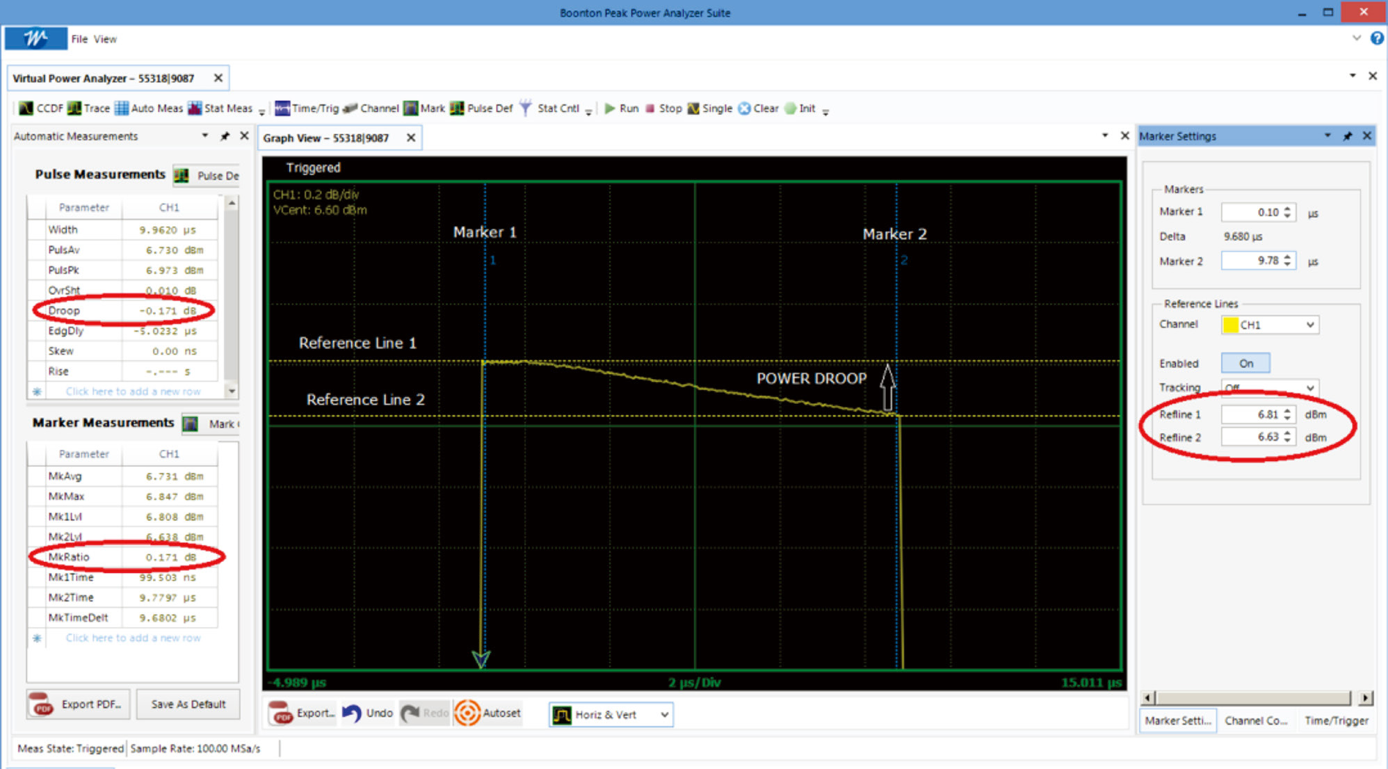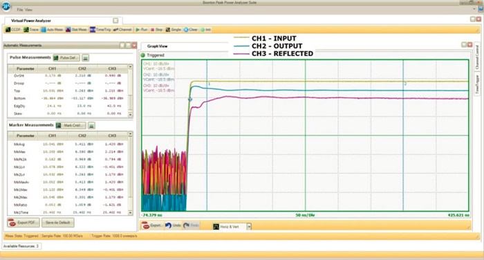 圖 8 顯示了使用圖 7 中的測試配置,並運用 55 系列峰值功率感測器量測到的三個波形,輸入波形顯示在 CH1,反射波形顯示在 CH3,輸出波形顯示在 CH2,請注意,在所有三個通道上執行的自動量測結果顯示在軌跡顯示視窗的左側,這些量測結果可以傳輸到試算表,以執行必要的增益和回波損耗計算,以及其他感興趣的參數,在自動化測試環境中,也可以透過遠端編程存取相同的量測結果,以執行增益和回波損耗的計算,圖 9 使用 Boonton 55318 USB 峰值功率感測器展示了下垂量測功能,功率下垂可以使用自動脈衝量測或自動標記量測以及水平標記來量測,自動標記量測可以透過在波形上期望的點放置標記並使用 MkRatio 來顯示下垂,或者,可以在垂直軸上期望的脈衝高點和低點放置參考線來量測下垂,自動脈衝量測是依據脈衝定義自動計算的,與標記或參考線的位置無關。