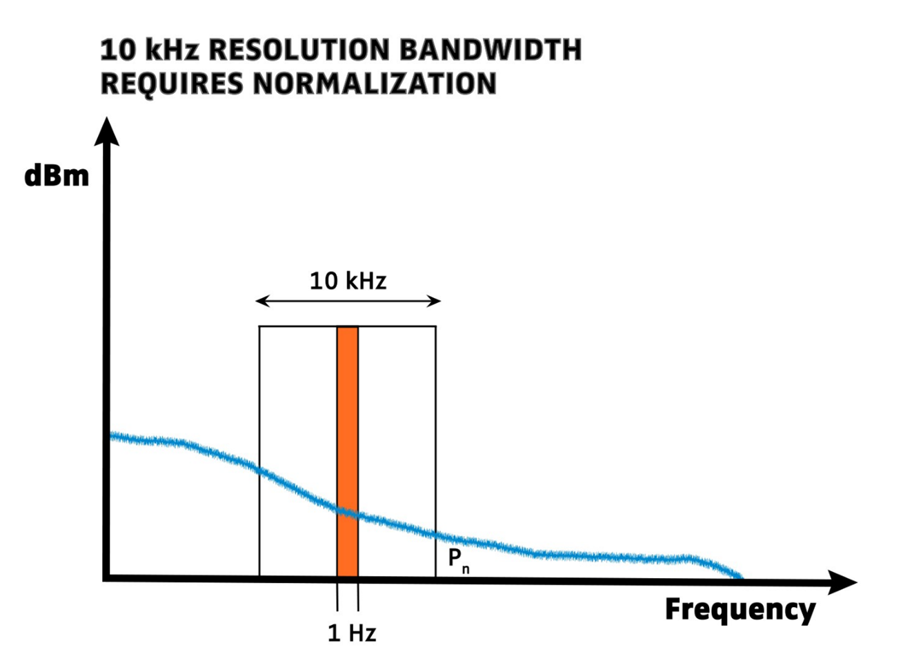 頻譜分析儀使用 RBW 濾波器量測功率,該濾波器的寬度通常大於 1 Hz,由較寬的 RBW 濾波器量測到的雜訊功率必須正規化至 1 Hz 頻寬,此正規化是透過將量測到的雜訊功率值減去 N dB 來完成,其中 N=10×log(RBW in Hz)。