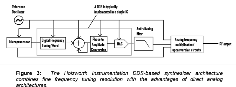 DDS 提供低雜訊、快速切換的訊號合成,並具備極精細的頻率調諧解析度(frequency tuning resolution),然而,其直接輸出頻率範圍有限;因此浩茲沃透過直接類比倍頻與升頻架構擴展 DDS 可達的頻率範圍。