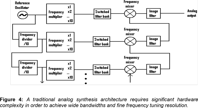 圖 4 為一種傳統類比合成器架構,其運作方式是透過頻率倍頻(Multiplication)、頻率分頻(Division)、選擇性濾波器、頻率混頻器、以及影像濾波器,來產生所需的類比頻率。