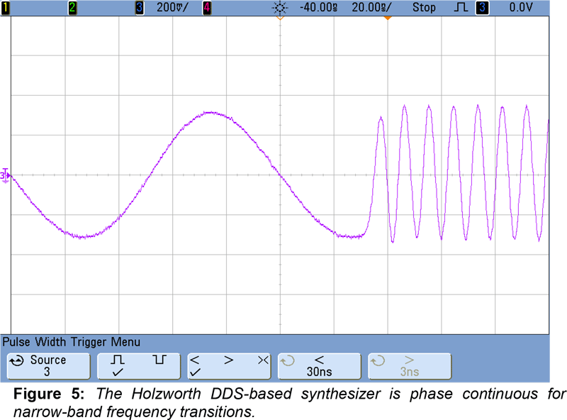 圖 5 顯示了浩茲沃 (Holzworth) 合成器在10MHz 切換至 110MHz時的示波器截圖,在這個過程中,相位保持連續,與圖 1 中的第一個範例波形相似,沒有發生相位突變(Phase Jumps)。