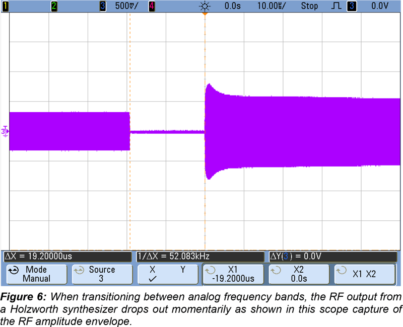 圖 6 顯示了浩茲沃 (Holzworth) 合成器在不同類比頻段之間切換時的示波器截圖,在頻段切換的過程中,射頻(RF)輸出會短暫中斷,因為系統需要重新鎖定新的頻段。