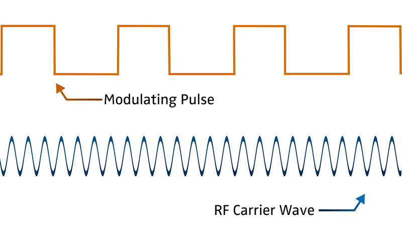 脈衝訊號則是在「開啟」與「關閉」狀態之間交替切換,當脈衝對射頻載波進行調變時,載波的行為會從連續發射轉變為週期性的突發脈衝,這種脈衝調變射頻訊號被廣泛應用於脈衝雷達等領域,雷達發射脈衝訊號後,會接收從目標反射回來的延遲脈衝。