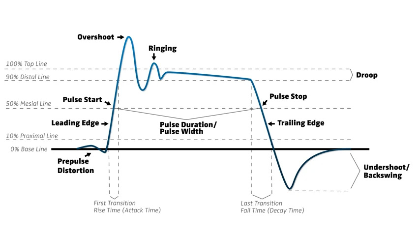 過衝 (Overshoot) 緊隨在上升邊緣之後發生,此時波形會超過預期的準位,而下衝 (Undershoot) 則是其對應現象,發生在脈衝下降邊緣之後的相反方向,在透過過衝超過目標值後,訊號在達到其穩態值之前,會經歷不必要的振盪或振鈴假影 (Ringing Artifacts)。