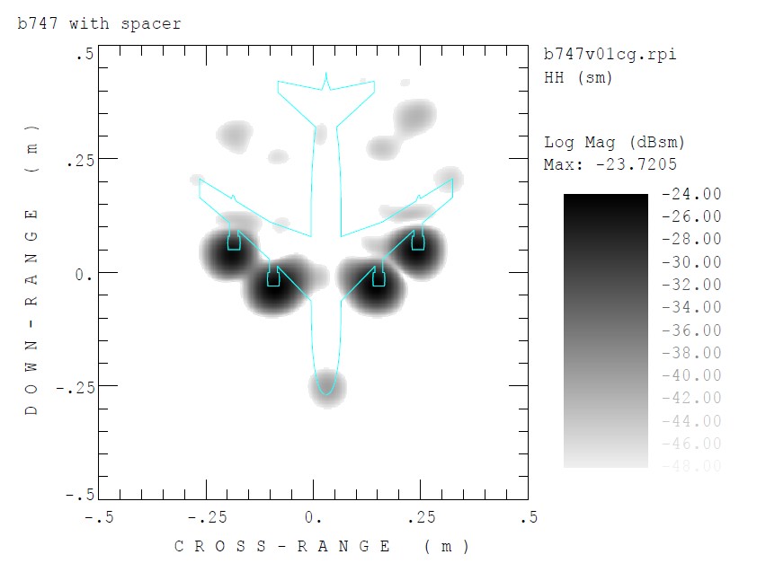 B747 飛機模型(1:100 比例)的 ISAR 成像圖,圖中亮點清晰標示出飛機的主要散射源位置,如引擎進氣口與機翼前緣,這對於分析物體的雷達特徵至關重要。
