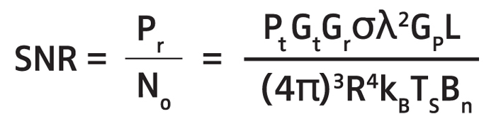 在雷達應用中,雜訊密度通常歸一化為 Bn,即 1/τ(封包脈衝寬度),此雜訊密度值 No 必須加到雷達測試系統的電子雜訊中,並包含接收器的雜訊指數以及所有射頻路徑元件的溫度(以 °K 表示),放大器雜訊指數的計算方法可在大多數微波工程教科書中找到,但本文將省略,以下計算系統 訊噪比 (SNR) 的公式採用了先前計算的接收功率 (Pr) 和雜訊密度 (No) 值,公式中還加入了處理增益 Gp 和損耗 L 的考量,大多數雷達的設計都使得 Bn 約等於 1/τ(封包脈衝寬度),No = Ts = 熱雜訊 + 歸一化至 Bn 的電子雜訊密度。