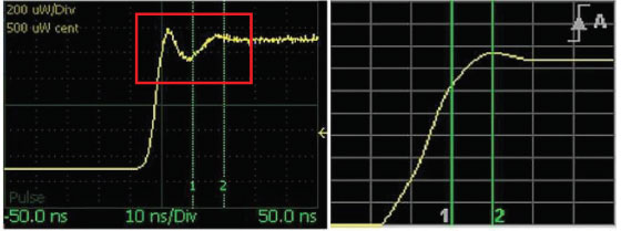 如下方圖示所示,圖 2a 的結果是運用一款具有 100 ps 時間解析度的先進測試儀器所獲得,該儀器精確地顯示了在脈衝起始位置一個較高的過衝現象,以及隨後出現的一些振鈴效應;與此形成對比的是右方的螢幕截圖(見圖 2b),由於其採用的是一款時間解析度能力較差的儀器,因而未能成功捕捉到關鍵的過衝和振鈴現象。採用具備領先效能的測試設備是極為重要的,因為在此特定的案例中,如果未能對此過衝現象給予適當的考量與處理,它很可能會導致雷達放大器進入壓縮狀態,或者降低雷達接收器的靈敏度,進而影響整個雷達系統的效能。
