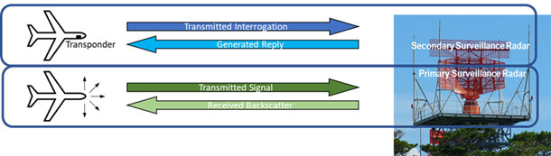 SSR 的主要功能是輔助初級雷達系統運作,初級雷達的訊號首先由地面天線發射出去,當雷達脈衝接觸到航空器後會被反射回來,並再次由地面雷達天線捕獲(其基本原理可參考圖 3)。初級雷達透過精確量測初始發射訊號與偵測到反射雷達訊號之間的時間間隔,來收集航空器的方位和距離等基本資訊。然而,初級雷達完全仰賴訊號的反射,而 SSR 的運作則取決於航空器上是否裝備了應答器。此應答器如同一個無線電接收器和發射器的配對組合,它會從詢問器(通常是指與 SSR 和初級雷達設備共置的地面站)接收詢問訊號,該詢問訊號的目的是請求特定的飛行資訊;應答器在接收到詢問後,隨即會發射一個包含所請求資訊的編碼訊號作為回應。