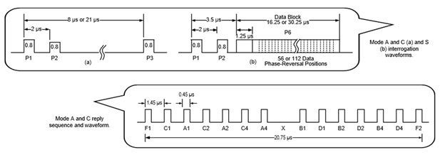 詢問器並非在每一次操作中都發送完全相同的詢問訊號,這些發射的波形可以根據需求而變化,並且依照其 P1 和 P3 脈衝之間的間隔差異,被劃分成多種不同的模式(如圖 4 所示)。每種模式都具有其特定的設計用途,並因此會從航空器的應答器引發不同類型的回應。一般而言,詢問訊號主要可以被區分為以下三種主要模式: