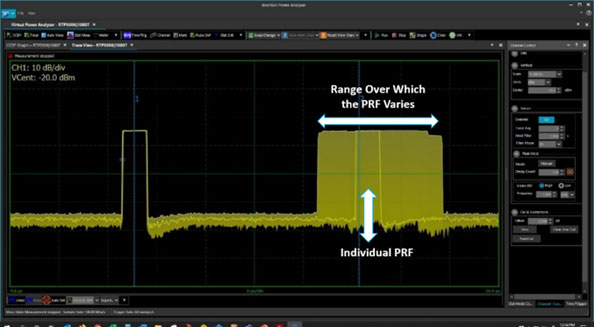 為了準確地判定 ECM 技術的實際有效性,所使用的射頻功率量測儀器必須具備能夠精確判定 PRF 變化範圍的能力,而目前最先進的測試設備已經可以有效地量測並透過友善的使用者介面輕鬆顯示此種 PRF 的動態變化情形。透過運用專門的 PRF 範圍量測工具,工程師們可以有效地驗證所部署之 ECM 策略的實際效果。如圖 7 所示,該圖例示了一個現代化的顯示介面,其中不僅呈現了個別的 PRF 量測值,同時也清晰地展示了 PRF 在一段時間內的變化範圍與趨勢。