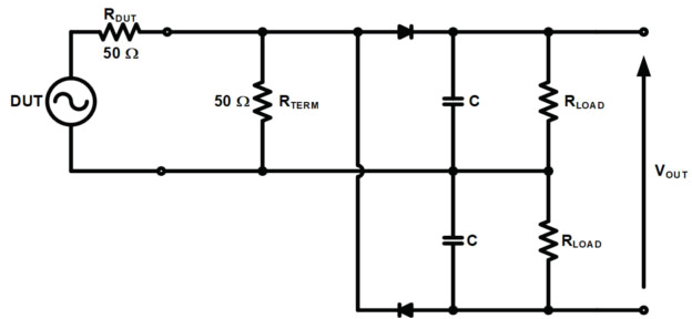 圖一、此為一個典型的二極體射頻功率偵測電路,採用電壓倍增器架構;輸入訊號經由 50Ω 終端電阻(RTERM)進行阻抗匹配,再透過二極體與電容組成的電路進行整流濾波,將高頻 RF 訊號轉換為與輸入功率相對應的 DC 電壓(Vout)進行量測。