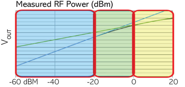 DC 電壓與所測得功率之間的關係,取決於二極體的操作區間,通常可劃分為三個區域,分別是平方律區、轉換區與線性區(如圖 2 所示)。