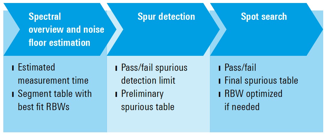 量測流程圖:圖中為 R&S®FSW-K50 雜散量測應用程式內部的三步驟量測流程。