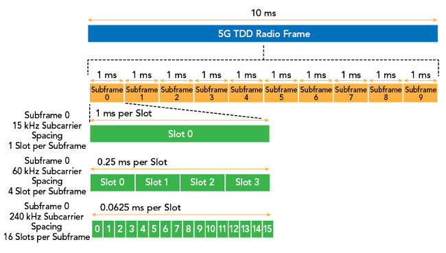 圖 1:10 ms 5G TDD 無線電訊框,顯示 1 ms 子訊框以及在 15、60 和 240 kHz 子載波間距下的子訊框 0 時槽組態。