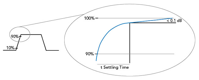 圖 2:脈衝穩定時間,定義為訊號從最大值的 90% 達到其最大值 < 0.1 dB 所需的時間,響應時間是上升時間 + 穩定時間。