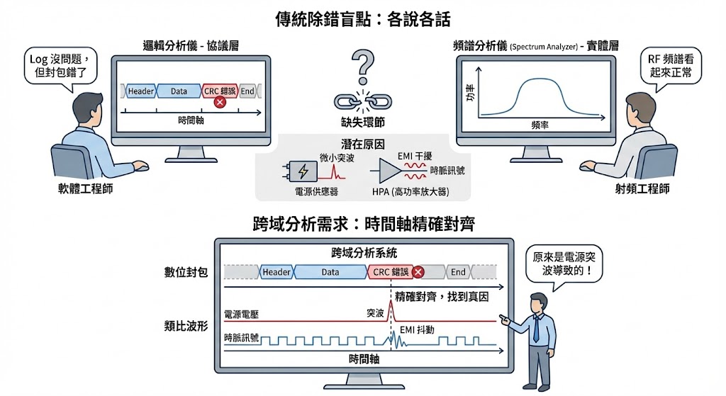 研發人員往往陷入兩難:射頻工程師看著頻譜分析儀說 RF 沒問題,軟體工程師看著 Log 說程式碼沒 bug,但系統就是會偶發性當機,這中間缺失的環節,就是將「類比波形」與「數位封包」在時間軸上精確對齊的能力。