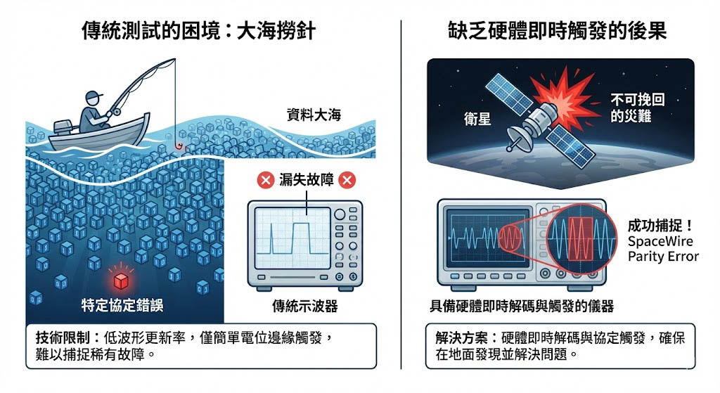 • 技術限制: 傳統示波器的波形更新率有限,且觸發系統通常只能針對簡單的電位邊緣進行觸發,要捕捉一個隱藏在數十億個正常位元中的特定協定錯誤(例如:SpaceWire 的 Parity Error 或特定的控制字元序列),就像在大海撈針。若儀器沒有具備基於硬體的即時解碼與觸發能力,這類問題往往會被遺漏,直到衛星發射升空後才釀成不可挽回的災難。