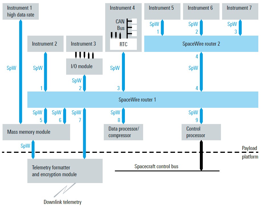 SpaceWire 架構:使用了兩台 SpaceWire 路由器,以提供衛星內不同儀器與模組之間的連通性。
