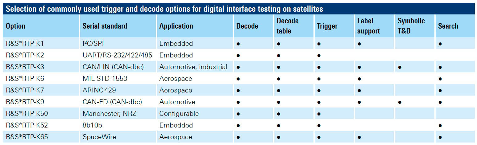 除了 SpaceWire (R&S RTP-K65) 與 SpaceFibre (基於 8b/10b 的 R&S RTP-K52),該平台也支援 MIL-STD-1553 (R&S RTP-K6)、ARINC 429 (R&S RTP-K7) 以及 CAN/CAN-FD 等常見於衛星平台與酬載控制的匯流排標準,這意味著只需一套系統,即可涵蓋衛星從傳統低速控制到現代高速資料傳輸的所有測試需求。