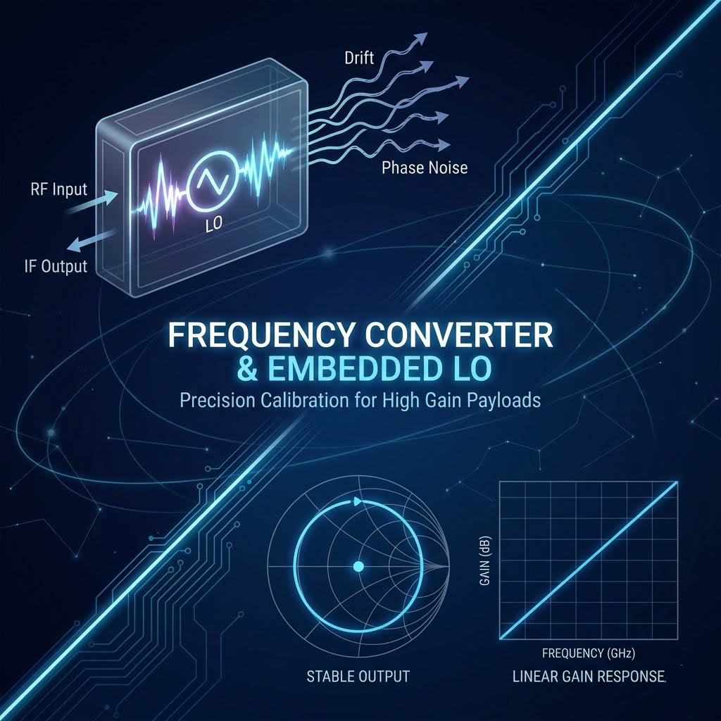 在衛星通訊酬載(Payload)的架構中,頻率轉換器(Frequency Converter)扮演著將地面上傳訊號(Uplink)轉換至下行頻率(Downlink)的關鍵角色,隨著衛星通訊走向高頻段(Ka, Q/V Band)與高通量(HTS),轉換器的設計已從單純的混頻模組演變為包含放大器、濾波器與 嵌入式本地振盪器(Embedded Local Oscillator, LO) 的複雜次系統。