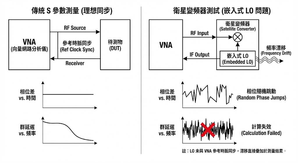 傳統的 S 參數測量依賴於 VNA 的源端與接收端嚴格同步,但在測試衛星變頻器時,輸入訊號是 RF 頻率,輸出是 IF 頻率,兩者之間的頻率差由內部的 LO 決定。