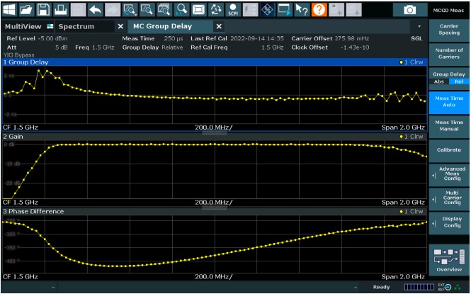 R&S FSW 頻譜分析儀和 R&S SMW200A 訊號產生器,能以快速、直接的方式量測衛星轉發器、頻率轉換器和其他組件的絕對與相對群組延遲,在多載波群組延遲量測方法中,訊號產生器會傳送一個多載波連續波 (CW) 訊號作為激勵源,載波的數量及其間距(孔徑)可以更改,以滿足待測物 (DUT) 的要求。