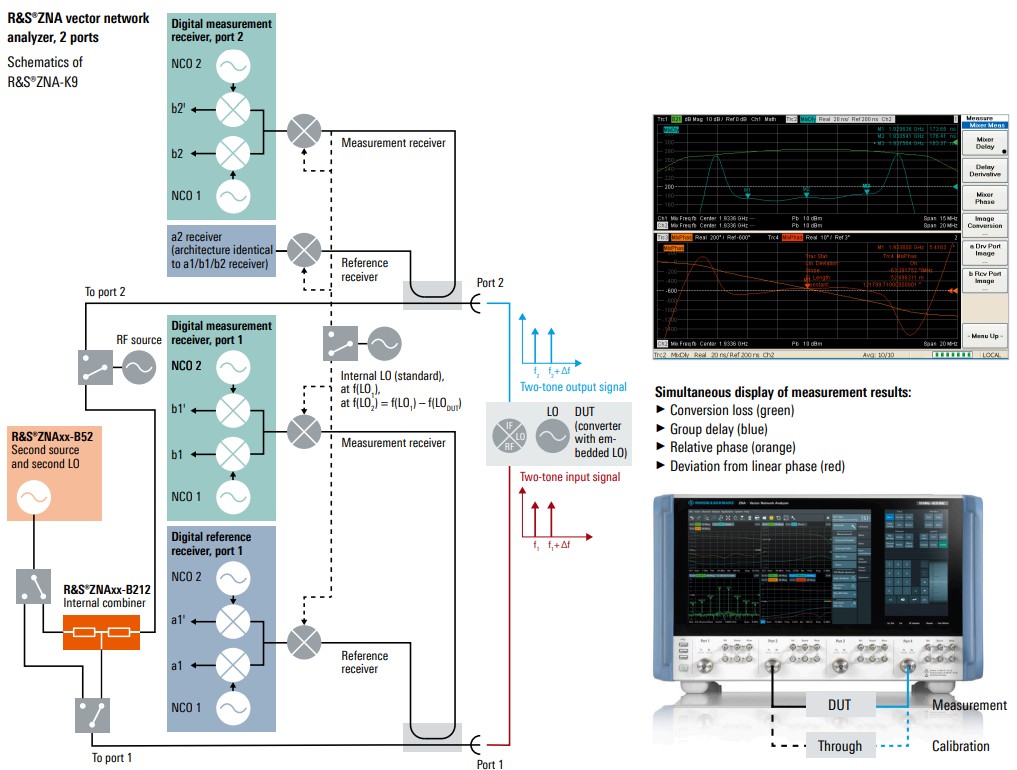 為了量測不同頻率的兩個訊號之間的相位,R&S 為 R&S ZNA 開發了獨特的前端,校準時僅需要一個「未知」 (unknown through) 的直通混頻器,這種方法非常適用於內部 LO 不穩定的頻率轉換 DUT,因為 DUT 內部 LO 的頻率和相位偏差可以在 IF 頻寬範圍內(即高達幾 MHz)。