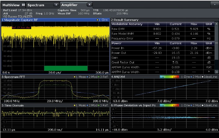為了解決放大器在高效工作時產生的非線性及記憶效應,R&S FSW 提供了強大的數位預失真 (DPD) 分析和校正工具:
