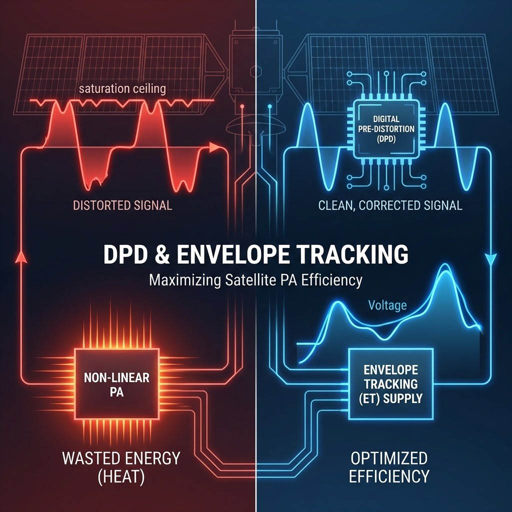 依據 ECSS-E-ST-50-12C 與 3GPP TR 38.811 (針對 NTN) 等標準,對於線性度的要求已不再僅是簡單的三階互調截點(IP3),現代規範要求在滿載寬頻訊號下,必須同時滿足嚴格的 鄰道洩漏比(ACLR) 與 EVM 限制,這迫使業界必須導入更先進的線性化技術:數位預失真(DPD) 與 封包追蹤(ET)。