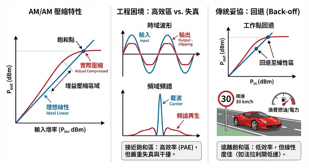 - 傳統妥協:過去的做法是將 PA 的工作點大幅「回退(Back-off)」,使其運作在低效率的線性區,這就像是用一台法拉利跑車永遠只開時速 30 公里,雖然穩,但極度浪費燃油(電力)。